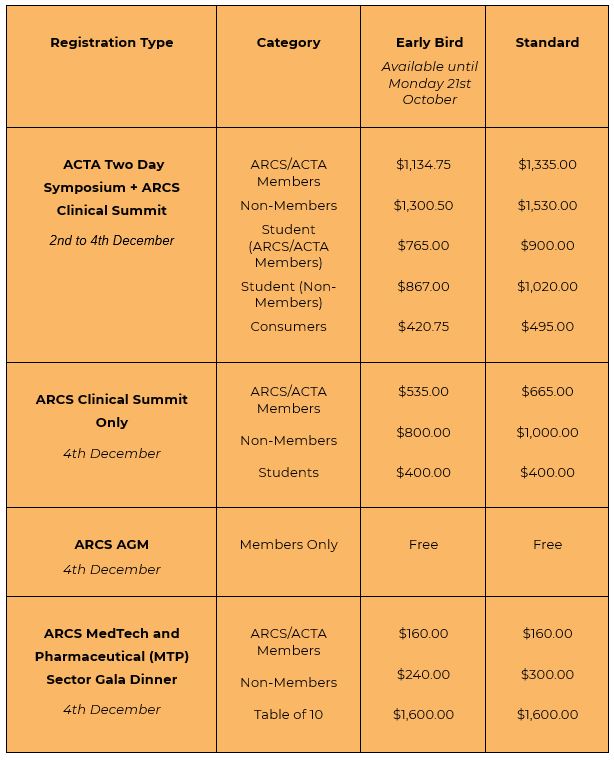 - ACTA Two-Day Symposium & ARCS Clinical Summit &/or MTP Sector Gala Dinner &/or Accommodation (2-4 Dec)